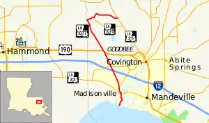 In the original Louisiana Highway system in use between 1921 and 1955, LA 1077 was primarily designated as State Route 188.[7] This includes the entire north–south portion between Lake Pontchartrain and the St. Tammany–Tangipahoa parish line. Route 188 was added to the state highway system by an act of the state legislature in 1928.[8]