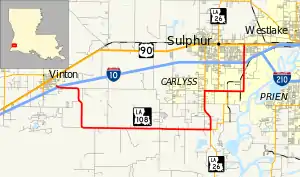 Louisiana Highway 108 (LA 108) is a state highway located in western Calcasieu Parish, Louisiana that runs 24.8 miles (39.9 km) in a general west–east direction from Interstate 10 (I-10) in Vinton to U.S. Highway 90 (US 90) in Sulphur.[1] The highway runs in roughly a "U" shape along section line roads, dipping southward from Vinton then east parallel to I-10 and back to the north toward Sulphur. The majority of the route is signed west–east except for the eastern leg running north to Sulphur, which is signed north–south. The latter section is also the most travelled, providing access to the oil and petrochemical industry south of Sulphur and a connection to LA 27.