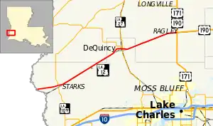 Louisiana Highway 12 (LA 12) is a state highway located in southwestern Louisiana. It runs 34.64 miles (55.75 km) in an east–west direction from the Texas state line west of Starks to a junction with U.S. Highway 171 (US 171) and U.S. Highway 190 (US 190) in Ragley.