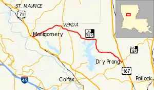 Louisiana Highway 122 (LA 122) is a state highway located in Grant Parish, Louisiana. It runs 26.10 miles (42.00 km) in an east–west direction from the junction of U.S. Highway 71 (US 71) and LA 1239-1 in Montgomery to LA 123 in Dry Prong.