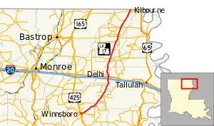 Louisiana Highway 17 (LA 17) is a state highway located in northeastern Louisiana. It runs 66.53 miles (107.07 km) in a north–south direction from the junction of U.S. Highway 425 (US 425), LA 4, LA 15, and LA 130 in Winnsboro to the Arkansas state line at Kilbourne.