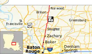 Louisiana Highway 19 (LA 19) is a state highway located in southeastern Louisiana. It runs 33.93 miles (54.61 km) in a north–south direction from U.S. Highway 61 (US 61) in Baton Rouge to the Mississippi state line north of Norwood.