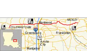 From the west, LA 38 begins at a junction with LA 10 about midway between Clinton and Greensburg. The junction is located in Coleman Town, a small rural community in St. Helena Parish. The undivided two-lane highway briefly heads northeast to Chipola, intersecting LA 432, then turns due east to Easleyville. Here, LA 38 crosses LA 43, another connection to the parish seat at Greensburg. Just east of Easleyville, the highway crosses the Tickfaw River and has a short concurrency with LA 441, which parallels LA 43 throughout the parish. 5.5 miles (8.9 km) later, LA 38 crosses into Tangipahoa Parish.[2][3][4]