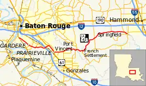 LA 42 turns southeast and overlaps US 61 out of East Baton Rouge Parish and into Ascension Parish for 3.3 miles (5.3 km). At this point, LA 42 turns eastward and meanders its way across the Amite River and into Livingston Parish, intersecting LA 16 at Port Vincent. For the next 3.1 miles (5.0 km), LA 42 and LA 16 run concurrently into the north end of French Settlement. LA 42 proceeds eastward through rural Livingston Parish until reaching its terminus at LA 22 in the town of Springfield.[1] As of 2018, the portion west of US 61 is under agreement to be removed from the state highway system and transferred to local control.[2]