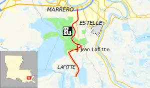 Louisiana Highway 45 (LA 45) is a state highway located in Jefferson Parish, Louisiana. It runs 22.08 miles (35.53 km) in a north–south direction from a dead end at Bayou Barataria in Lafitte to a junction with LA 18 in Marrero.