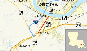 From the south, LA 52 begins at an intersection with US 90 (the future corridor of I-49) in Boutte. US 90 connects to New Orleans to the east and Houma to the southwest. Directly opposite the intersection is the northern terminus of LA 633 (Magnolia Ridge Road). LA 52 heads north on Paul Maillard Road, immediately intersecting LA 631 (Old Spanish Trail) and crossing the BNSF/Union Pacific Railroad tracks at grade. 0.9 miles (1.4 km) later, LA 52 crosses from Boutte into Luling, passing through a largely residential neighborhood with scattered businesses. After another 1.5 miles (2.4 km), LA 52 has another grade crossing with the Union Pacific Railroad. The highway ends shortly afterward at an intersection with LA 18 (River Road). LA 18 runs along the west bank levee of the Mississippi River and connects to the Hale Boggs Memorial Bridge on I-310, a distance of 0.8 miles (1.3 km) upriver.[2][3][4]