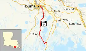 Louisiana Highway 57 (LA 57) is a state highway that serves Terrebonne Parish. It runs 25.1 miles (40.4 km) in a south to north direction along Bayou Sale Road and Grand Caillou Road, connecting Cocodrie and Houma.[1]