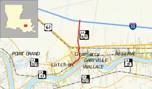 Louisiana Highway 641 (LA 641) is a state highway in Louisiana that serves St. James Parish. It travels 6.9 miles (11.1 km) in the shape of a capital J, starting northwest, veering northeast, and then turning north, serving the communities of Lutcher and Gramercy and providing a connection to Interstate 10 (I-10) for those towns.