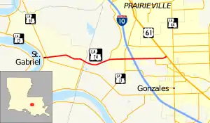 Louisiana Highway 74 (LA 74) is a state highway located in southeastern Louisiana. It runs 10.67 miles (17.17 km) in an east–west direction from LA 75 in St. Gabriel to U.S. Highway 61 (US 61) north of Gonzales.