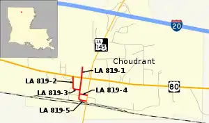 Louisiana Highway 819 (LA 819) is a collection of five state-maintained streets located in the Lincoln Parish village of Choudrant that have a total length of 0.58 miles (0.93 km).[1] All five routes were established in the 1955 Louisiana Highway renumbering[2] and are presently unsigned.