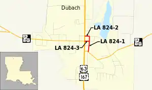 Louisiana Highway 824 (LA 824) is a collection of three state-maintained streets located in the Lincoln Parish town of Dubach that have a total length of 0.38 miles (0.61 km).[1] All three routes were established in the 1955 Louisiana Highway renumbering[2] and are presently unsigned. As of 2017, the routes are currently under agreement to be transferred to local control.[3]