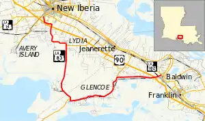 La 83—From a junction with La 14 at or near Curtis through or near Lydia and Weeks Island to a junction with La-US 90 at or near Baldwin.
