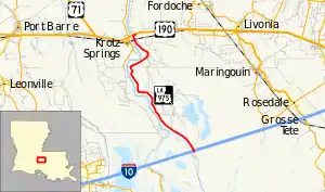 The short route actually runs south of Interstate 10 (I-10) a few miles and makes a loop. The access road from I-10, exit 127 south, has been barricaded and thus the only direction of travel is north. The route is a poorly maintained gravel road that, as most roads of this type, is very dusty during the dry season. Starting in Iberia Parish, LA 975 crosses into St. Martin Parish, then Pointe Coupee Parish before intersecting with US 190. The road travels north through the swampy bottomland of the Atchafalaya Basin, that is part of the Morganza Flood way system,[4] and prone to severe flooding with high water. LA 975 passes Bobtail Bayou, intersects with Bayou Manuel Road, which is at the split of the Atchafalaya River and the beginning of the Whiskey Bay Pilot Channel, then passes the base of Big Alabama Bayou, intersecting with River Road. Continuing north, LA 975 begins to run between the Atchafalaya River, Little Alabama Bayou, and intersects with Happytown Road. At this point Coswell Bayou begins to run in between LA 975 and the Little Alabama Bayou to a point just north of the Point Coupee Parish line. LA 975 intersects Main Road before continuing to the northern terminus at US 190 and LA 973.[3]