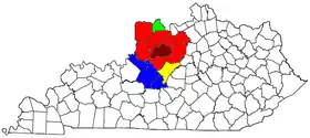 The formal name given to the area by the Census Bureau is the Louisville–Jefferson County, Kentucky–Indiana, metropolitan statistical area, though it is regularly referred to as Kentuckiana. It is now the primary MSA of the Louisville/Jefferson County–Elizabethtown–Bardstown, KY-IN Combined Statistical Area, created by the United States Bureau of the Census in 2000 and recently redefined in 2018. The combined statistical area (CSA) adds the counties of Hardin County, Kentucky, LaRue County, Kentucky, Jefferson County, Indiana, and Nelson County, Kentucky and comprises the Louisville–Jefferson County MSA, the Elizabethtown–Fort Knox, Kentucky, MSA, the Bardstown, Kentucky, micropolitan statistical area and the Scottsburg, Indiana micropolitan statistical area.[4] In 2020, the Census Bureau measured the combined statistical area's population at 1,601,309.