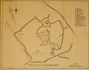 A 1726 engraving, The North East View of Louth Park Abbey near Louth in the County of Lincoln, by Samuel and Nathaniel Buck, shows the remains of a number of stone walls standing.[17] A similar view is presented in an engraving of the abbey ruins from 1770 in Robert S. Bayley's Notitiæ Ludæ, Or Notices of Louth.[18]