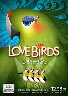 Love Birds is an original musical with book, music and lyrics by Robert J. Sherman. The musical officially premiered at the 2015 Edinburgh Fringe Festival at The Pleasance on August 7, 2015. The production was directed and choreographed by Stewart Nicholls. Prior to the Edinburgh run, there were two previews held in London at the Lost Theatre (in Stockwell) on July 28 and 29.[1] The Original Edinburgh Cast Recording was recorded on July 30 and mixed and mastered on July 31 and August 3 and was first released by SimG Records on August 12 at the Edinburgh Festival.[2] Two Edinburgh previews took place on August 5 and 6 with Press Night taking place on August 8. The final festival performance took place on August 31. The show starred Ruth Betteridge, Greg Castiglioni, John Guerrasio, George Knapper, Jonny Purchase, Joanna Sawyer, Anna Stolli, Rafe Watts and Ryan Willis. In its end of the year round-up of regional British fringe musical theatre, Musical Theatre Review hailed Love Birds: "a triumph of whimsy, a children’s story written with adult sensibilities and featuring a cracking score that celebrated the lost era of vaudeville. Blessed with an equally strong design from Gabriella Slade and some marvellously sensitive performances, Love Birds was probably the most accomplished piece of musical theatre to arise from the many delights at this year’s festival."[3]