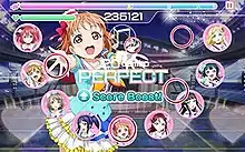 The game had two gameplay modes—"Story" and "Live"— which featured all nine members of the idol groups μ's and Aqours.[lower-alpha 2] Players acquired a score in the rhythm "Live" mode, in which they could tap circles at the proper time in order to receive a high score that can be placed on the leader board. These songs were divided into 4 difficulties: Easy, Normal, Hard, and Expert. Another difficulty called "Master" featured songs that were only available for a limited time and included rhythm icons where players had to swipe their fingers on the screen during some songs.