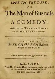 Love In The Dark; Or, The Man of Bus'ness is a 1675 comedy play by the English writer Francis Fane. It was first staged by the King's Company at the Theatre Royal, Drury Lane in London. The epilogue was written by the Earl of Rochester, and may also have contributed some of the more libertine lines to the play.[1] It is set in Venice.