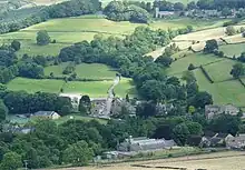The area to the west of the village is a rural area known as Bradfield Dale and contains the three reservoirs of Agden, Dale Dike and Strines which were constructed in the 1860s. The many construction workers who came into the dale prompted the Haychatter Farm to open a public house on its premises known as the Reservoir Inn and then the Haychatter which remained open until 2003. The dale contains Sugworth Hall which dates from a least the 16th century although the building has been much changed since then. Eminent families who have lived there include the Hooles and the Boots. Charles Boot built a folly tower overlooking Strines Reservoir in 1927 known as Boot's Folly, it is a prominent landmark for miles around.[10] Another ancient residence in the dale is Hallfield House which dates from the Elizabethan era and was the seat of the Greaveses, a very old Hallamshire family. The dale also includes the Strines Inn public house.[11]
