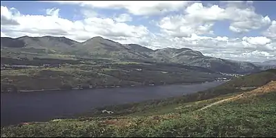 There are extensive views of Coniston Water from the two cairns which Wainwright visits on the ascent, and from the track used for the return journey.