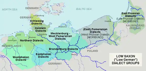 Low Prussian (German: Niederpreußisch),[1] sometimes known simply as Prussian (Preußisch), is a moribund dialect of East Low German that developed in East Prussia. Low Prussian was spoken in East and West Prussia and Danzig up to 1945. In Danzig it formed the particular city dialect of Danzig German. It developed on a Baltic substrate through the influx of Dutch- and Low German-speaking immigrants. It supplanted Old Prussian, which became extinct in the 18th century.