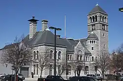 The 1895 Lowell Post Office is an historic post office building at 89 Appleton Street in Lowell, Massachusetts. The imposing two-story granite building was completed in 1895 to a design by W. J. Edbrooke. The building has an H shape, and has a profusion of typical Richardsonian Romanesque features, included rounded arches over windows and a recessed entry. The focal point of the building is its five-story square clock tower, which is topped by a pyramidal roof supported by tripled round arches on each face.[2]