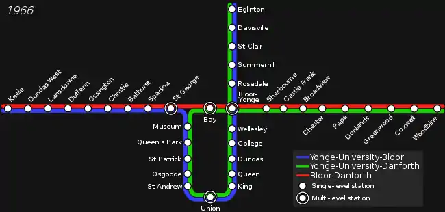 The platform was in service from February to September 1966 as part of an interlining experiment, in which the TTC ran trains along three routes, with one matching the subsequent Bloor–Danforth line, and the other two combining parts of the Bloor–Danforth line with the Yonge–University line. The experiment was deemed a failure, largely because delays anywhere quickly cascaded to affect the entire system.[8] Also, as the stations had not been laid out effectively for cross-platform interchange, trains travelling east from St. George and west from Yonge alternated between the two levels, leading passengers to wait on the stairs in-between the levels, since they were unable to tell which platform would receive the next train.[6]