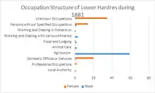 The dominating sector from 1881 was agriculture with a high concentration of workers, predominantly male who could have been considered more appropriate for the type of work due to physical presence. There was also a high level of populace that had unknown occupations, also being only prominent with females, this may have been the cause of childbirth as a mother that worked to care for the family at home. Other professions such as authority lodging and animal care, were given considerably fewer workers.