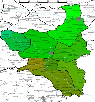 The dialect extends across the Central Sava Valley and most of the Lower Sava Valley, from Zgornji Log along the Sava River to the national border around Obrežje. It also extends along the lower course of the Savinja River from Debro to the Sava River and along the Krka River from Kostanjevica na Krki eastward. The dialect is not spoken in the (north)eastern part of Lower Sava Valley in the area around Brežice, Dobova, and Koprivnica, where the Kozje-Bizeljsko dialect is spoken. The border with Serbo-Croatian dialects follows the national border, except for the villages of Črešnjevec, Črneča Vas, Oštrc, Vrbje, and Vrtača, where Chakavian is traditionally spoken. The Sevnica-Krško subdialect extends north up to Sopota, Čimerno, Radeče, Žirovnica, Podgorica, and Podgorje ob Sevnični. The Laško subdialect extends westward up to Obrežje pri Zidanem Mostu, Senožete, Rimske Toplice, Trnovo, and Zgornja Rečica, whereas in Klenovo the Zagorje-Trbovlje subdialect is already spoken. Notable settlements include Sava, Litija, Polšnik, Zagorje ob Savi, Trbovlje, Hrastnik, and Zidani Most in the Zagorje-Trbovlje subdialect, Rimske Toplice and Laško in the Laško subdialect, and Radeče, Loka pri Zidanem Mostu, Dolenji Boštanj, Sevnica, Blanca, Brestanica, Senovo, Krško, Studenec, Leskovec pri Krškem, Raka, Cerklje ob Krki, Podbočje, and Kostanjevica ob Krki in the Sevnica-Krško subdialect.[3][5]