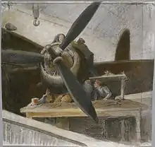 After the war Luard's interests broadened to include landscapes and seascapes. He moved to London in 1934 and became a regular visitor to the racecourse and stables at Newmarket, where he would often paint scenes of thoroughbred racehorses training on the gallops.[2] In 1936 Faber and Faber published his book The Horse: Its Action and Anatomy, the first study of the skeleton, muscles and physiognomy of the horse since George Stubbs' treatise, The Anatomy of the Horse. During World War II, Lowes Luard was contracted to provide a number of works for the War Artists' Advisory Committee.[3][4] He died in London in 1944.