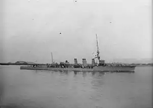 When he found he could not draw the German ships away, Tyrwhitt had returned and engaged the six light cruisers and escorts but broke off the action when seriously outgunned after the battlecruisers returned.[9] The light cruisers Rostock and Elbing had tried to lead the British ships into the waiting guns of the battlecruisers but upon sighting the German capital ships, the British cruisers turned south. The German battlecruisers opened fire, causing severe damage to the cruiser HMS Conquest, the destroyer HMS Laertes and slightly damaging one light cruiser. Conquest was hit by a shell, which reduced her speed and produced 40 casualties. Boedicker failed to follow the retreating ships, assuming they were faster and probably concerned whether other, larger vessels might be about.[9] The Germans ceased fire and turned north-west towards the rendezvous off Terschelling Bank, hoping the British cruisers would follow, which they did not.[2]