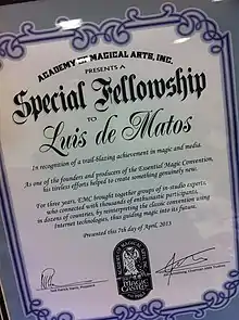 In 2013 Luis de Matos receives in Los Angeles, his third award by the Hollywood Academy of Magical Arts, the “Special Fellowship Award."[6]