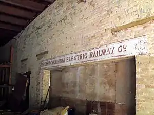 The building's dimensions are 42 feet (13 m) x 24 feet (7.3 m) x 56 feet (17 m) and contains three rooms. The first room contained the generators, while another housed the Pelton waterwheels, and the third, the transformers. Following the closure of the plant, the equipment was scavenged and was sold in the basement of the Capital Iron store, located in Victoria, and was lost to history. All that remains is the structure itself and a British Columbia Electric Railway sign, which cannot be safely removed.