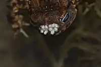 The adult toadfly lays its eggs on the skin at the entrance to the nostrils of the common toad although it has been known to infest other frog and toad species.[2] It often preferentially chooses sick or injured individuals. On hatching, the larvae start to feed on the tissue of the nostrils and work their way into the nasal cavities. The larvae grow rapidly and as their appetite increases, they start to consume the eyes, the brain and other tissues of the host.