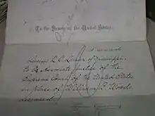 On December 6, 1887, President Cleveland nominated Lamar to be an associate justice of the Supreme Court of the United States, filling the seat of the late William Burnham Woods. The U.S. Senate confirmed Lamar by a 32–28 vote on January 16, 1888,[82] and was sworn into office two days later.[83] He was the first justice of Southern origin appointed after the Civil War. (Woods, though appointed as a resident of Alabama, had been a native of Ohio and a Republican.) He served on the court until his death.