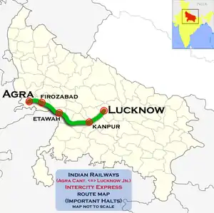 Lucknow - Agra Fort Intercity Express is an Intercity Express train of the Indian Railways connecting Agra Fort and Lucknow Junction in Uttar Pradesh. It is currently being operated with 12179/12180 train numbers on a daily basis.[1]