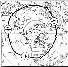 En route, the aircraft was refueled four times by KB-29M Superfortresses,[3] near Lajes Air Base in the Azores, Dhahran Airfield in Saudi Arabia, Clark Air Base in the Philippines, and Hickam Air Force Base in Hawaii, using the soon-to-be obsolete grappled-line looped-hose technique. Following the refueling near Luzon, Philippines, the refueling tanker encountered poor weather conditions and crashed on March 1, 1949, killing all nine crew aboard; the accident report was altered to state the tanker was on a routine training mission to keep the accident from casting a bad light on the Lucky Lady II's successful circumnavigation.[4]