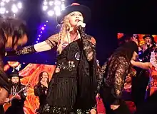 "Lucky Star" was included in four of Madonna's concert tours: The Virgin Tour (1985), Who's That Girl (1987), Confessions (2006), and Rebel Heart (2015–2016). On the Virgin Tour, Madonna performed the song wearing a black ensemble consisting of a crop top beneath a vest with a silver cross pattée, matching fringed elbow length gloves and miniskirt, leggings, low-heeled leather boots, and a crucifix earring in one ear.[64] The performance of the song at Detroit's Cobo Arena was included on the Madonna Live: The Virgin Tour video release (1985).[65] Two years later, it was sung as the second number of the Who's That Girl World Tour; the performance found the artist singing underneath a disco ball hung from above the stage.[66] She was decked out in the same black bustier from her "Open Your Heart" (1987) video, and her hair was platinum blonde and done in a big bushy style.[66] From the Chicago Tribune, Scott A. Zamost and Elizabeth Snead felt that, although Madonna's vocals sounded strong, she was "drowned out frequently and annoyingly by an overpowering back-up band" in numbers such as "Lucky Star".[67] Two different performances from the tour can be found on the releases Ciao Italia: Live from Italy, filmed at Stadio Communale in Turin, Italy on September 4, and Who's That Girl: Live in Japan, filmed at Korakuen Stadium in Tokyo, Japan on June 22.[68][69]