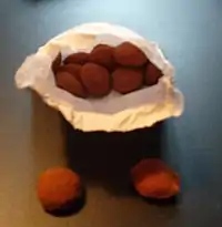 The Lucky Tattie is a type of traditional sweet made in Scotland. The lucky tattie is made of a white fondant solid core flavoured with cassia, and steamed and covered with cinnamon powder. The tattie used to contain a small plastic lucky charm in the centre (like a tiny animal or toy), hence the lucky. Due to health and safety concerns they were removed.[1]
