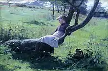 A milestone of Conant's time in France was the summer of 1888, which she spent in the Breton town of Concarneau, with her new friend Cecilia Beaux. Conant and her mother Catherine, and Beaux and her cousin May Whitlock were a foursome in Concarneau. In her autobiography, Background with Figures, Beaux described that summer's activities in detail.[4] Together they took lodging for the summer, which comprised two upstairs rooms in a house, and an attic which served as a kitchen, and afforded a view of the garden below and the sea in the distance.[4]: 141 In this pleasant venue, Beaux painted a portrait of Catherine,[4]: 147 [5] and Conant learned much from Beaux, who was twelve years her senior. Beaux described her as "a delicate, brilliant girl, struggling against ill-health and imperfect eyesight, to become the artist she was born to be ... [who] had superabundant humanity, and almost outdid me in instantaneous and warm interest in passing individuals, as well as in every sight and sound and color."[4]: 135–36 Of her language skills, Beaux wrote, "in about a week Lucy had become fluent in all of the Breton language she needed ..."[4]: 143