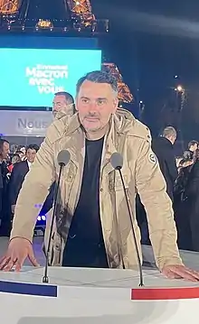In 2015[1] he joined Emmanuel Macron's team and became the first general secretary of his party, En Marche ! and its first official employee.[1] He was then appointed as deputy general secretary and coordinator of Macron's campaign operations for the 2017 French presidential election.[15] He was often described as a senior staffer in the candidate's team and one of its closest advisors,[1] earning the nickname of "ninja of logistics".[16]