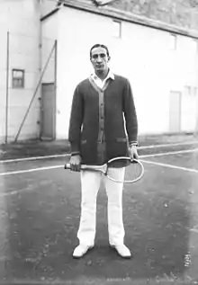 After the war, he made his comeback at the 1920 German International Tennis Championships, winning the doubles title with Oscar Kreuzer.[22] In 1924, the French Riviera tennis clubs refused him entry to their championships for his lack of sportsmanship.[23] In 1925, his playing license was suspended by the Austrian Lawn Tennis Federation for failing to show up at an international match in Breslau (this ban was lifted a couple of years later[24]).[25][26] During that season, he violated the attitude code on several occasions. In a Viennese doubles match, he insulted his recurring partner Suzanne Lenglen to the point that she dropped her racquet and quit the match.[25] He also provoked Irish player Charles Scroope in a Davis Cup meeting by constantly questioning the umpire's decisions.[25]