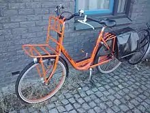 A Dutch utility bicycle with a rack attached over the rear wheel.