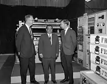 At the Radiation Laboratory he worked with Lawrence's experimental team, which was supported by a group of theoretical physicists headed by Robert Oppenheimer.[18] Alvarez devised a set of experiments to observe K-electron capture in radioactive nuclei, predicted by the beta decay theory but never observed. Using magnets to sweep aside the positrons and electrons emanating from his radioactive sources, he designed a special purpose Geiger counter to detect only the "soft" X-rays coming from K capture. He published his results in the Physical Review in 1937.[19][20]