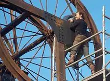 ![]() Perry installing his Pit Head sculpture in Walsall Wood. | |