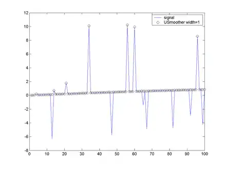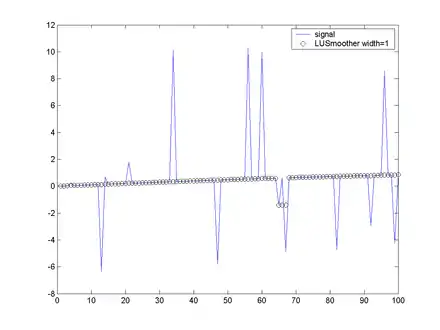 Applying a Lulu smoother consists of repeated applications of the min and max operators over a given subinterval of the data. As with other smoothers, a width or interval must be specified. The Lulu smoothers are composed of repeated applications of the L (lower) and U (Upper) operators, which are defined as follows: