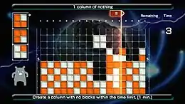 Lumines Live! is a puzzle game similar to its predecessor, Lumines: Puzzle Fusion. The objective of the game is to rotate, move, and drop colored blocks varying between two colors to form 2×2 squares of the same color.[1] A vertical line known as the Time Line sweeps over the playing field and will erase the colored squares, granting points to the player's overall score.[1] Deleting four or more squares will add a bonus multiplier to the player's overall score. Players lose the game when the blocks reach the top of the playing field.[2][3] Stages vary from thematic visual themes known as "Skins" that change the music, background, and sound effects.[2] There are seven game modes: Challenge mode, Puzzle, Time Attack, VS CPU, and Duel Mode.[1] In Challenge mode, players are tasked to survive as long as possible and gain the highest possible score. Puzzle mode tasks players to use the blocks to create specific shapes. Time Attack mode tasks players to clear as many squares as possible within an allotted time.[1] Time Attack mode also allows players to share a recording of their best playthrough. In VS CPU mode, players share the playing field with an AI opponent and must defeat them by clearing more squares than them, causing players to claim more of the playing field. In Duel Mode, players can compete with each other either locally or online. Unlike its predecessor, Lumines Live! also allows players to accumulate over one million points in a play session.[4]