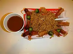 It is commonly served with agre dulce (sweet and sour) dipping sauce (which accentuates its "Chinese-ness").[1][6][10] It can also use other common lumpia dipping sauces like banana ketchup, sweet chili sauce, garlic mayonnaise, or vinegar with labuyo peppers and calamansi.[2]