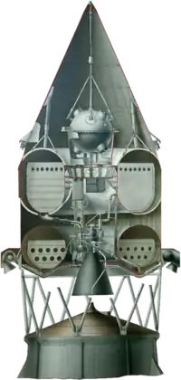 One mission separated Luna 1 and Luna 2, a launch failure that occurred with an unnamed probe on 18 June 1959.[14] Luna 2 would be the Soviet Union's sixth attempt to impact the Moon.[15] It was the second of the Ye-1a series, modified to carry a heavier payload of 156 kilograms (344 lb)[16] and had a combined mass of 390.2 kilograms (860 lb).[17] Luna 2 was similar in design to Luna 1,[18] a spherical space probe with protruding antennas and instrumentation.[19] The instrumentation was also similar to Luna 1,[18] which included a triaxial fluxgate magnetometer,[20] a piezoelectric detector, a scintillation counter, ion traps and two gas-discharge counters, while the Luna 2 included six gas-discharge counters.[21] There were no propulsion systems on Luna 2 itself.[22]