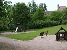 In spring 1923 the park was reopened by the amusement park entrepreneur Hugo Haase, who moved attractions there from his park in Stellingen, which had closed in 1922.[1][2] Inflation under the Weimar Republic and the resulting widespread poverty seriously affected business by that August, and Haase closed the park and had the buildings demolished. In the late 1920s the site was redeveloped, mostly for athletic grounds. A concrete unemployment office designed by Gustav Oelsner was built in 1926 on the site of the entrance building and is now a city landmark, and a block of flats on Memelandallee, also designed by Oelsner, is also on the former grounds. A street and a children's playground bearing the name Lunapark (located approximately on the site of the bandstand) are the only remaining indications of the park's existence.[1][2]